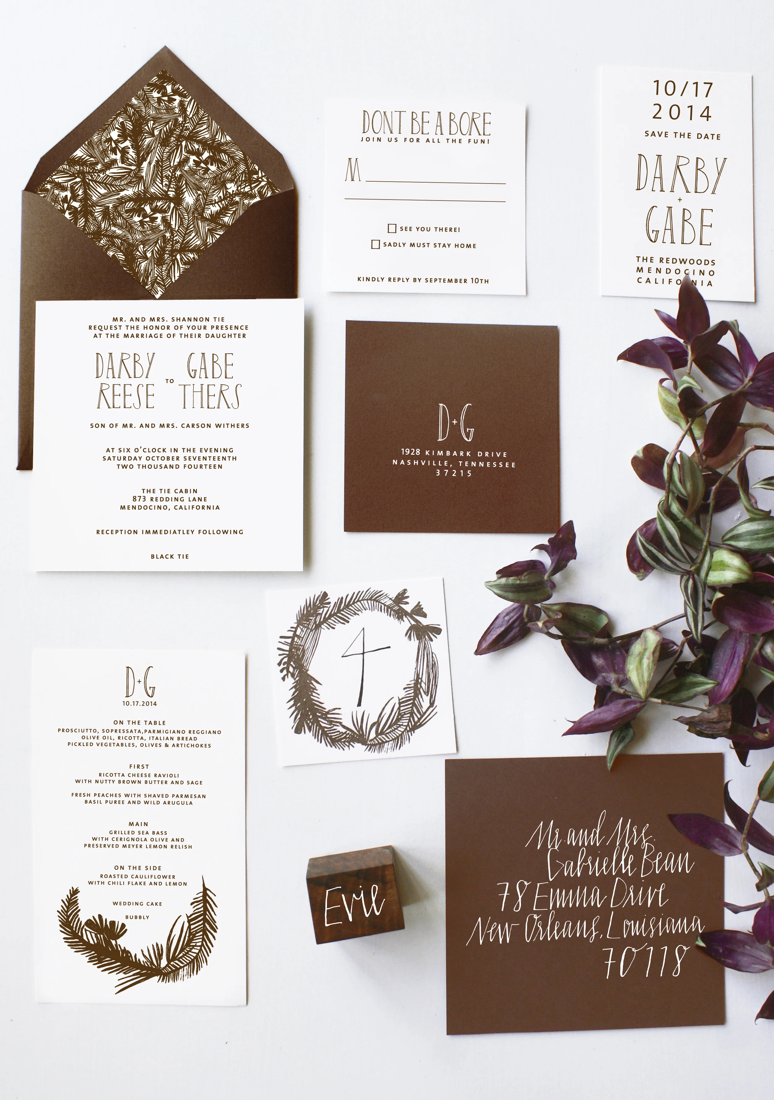WAS FLAT MATTE PRINTED IN A RICH CHOCOLATE INK ONTO DOUBLE THICK STOCK PAPER WITH A FONT DRAWN IN HOUSE BY HEW. THE ENVELOPES WERE CALLIGRAPHED IN WHITE INK IN HEWS SIGNATURE SCRIPT. THE ESCORT CARDS WERE BLOCKS OF WALNUT MADE BY THE GROOM AND INDIVIDUALLY CALLIGRAPHED WITH EACH GUESTS NAME BY HEW.