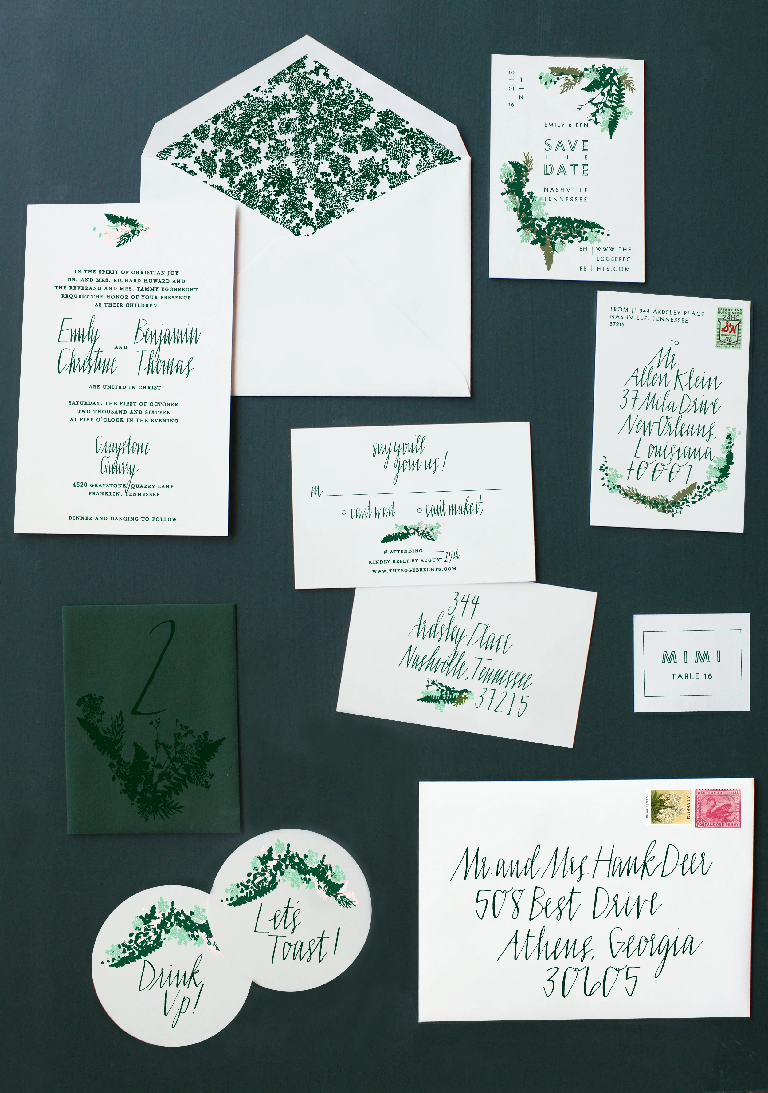 WAS INSPIRED BY THE EVERGREENS SURROUNDING THE LOVELY GRAYSTONE QUARRY OUTSIDE OF NASHVILLE WHERE THE DUO WAS MARRIED. IT WAS FLAT MATTE PRINTED IN GREENS AND BLUSHES WITH HEWS SIGNATURE SCRIPT PEPPERED THROUGHOUT.