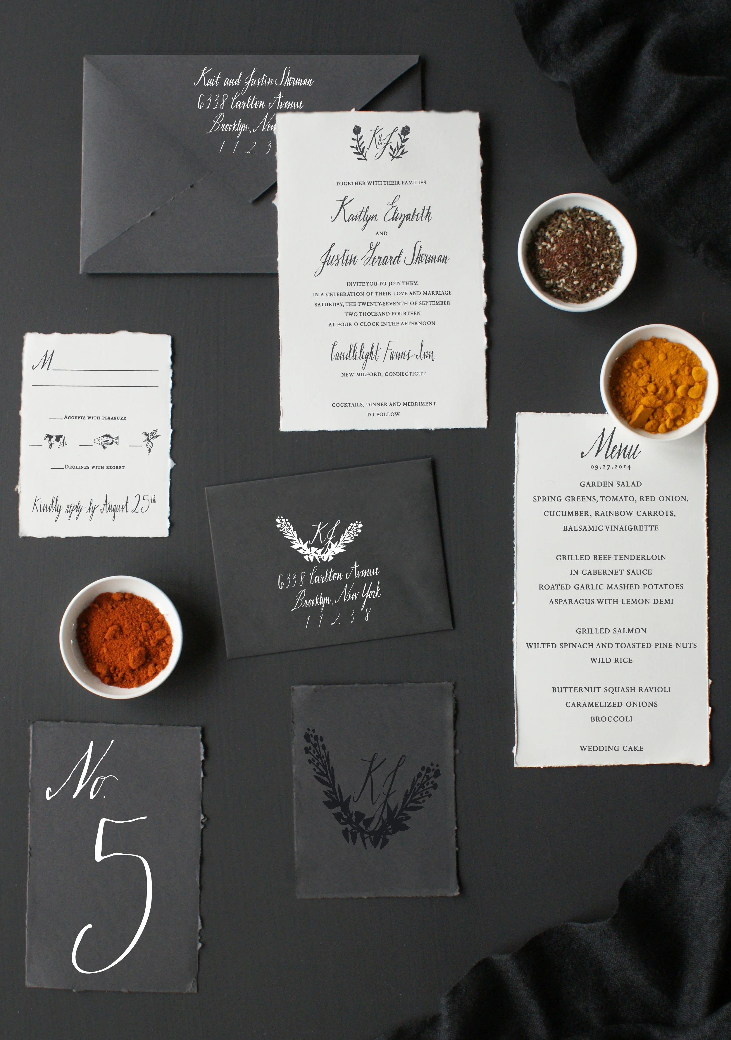 WAS INSPIRED BY THE FOLIAGE THAT FILLED THE COUPLES WEDDING SITE, CANDLELIGHT FARMS IN NEW MILFORD CONNECTICUT. IT WAS LETTERPRESSED IN CHARCOAL INTO 100% COTTON (TREE-FREE!) PAPER WITH DECKLED EDGES. THE DARK ENVELOPES WERE CALLIGRAPHED WITH WHITE INK IN THE VERY FIRST SCRIPT HEW DEVELOPED BY HAND. THE SHERMAN SUITE IS VERY SPECIAL TO HEW AS THEY WERE HEWS FIRST CLIENTS EVER.