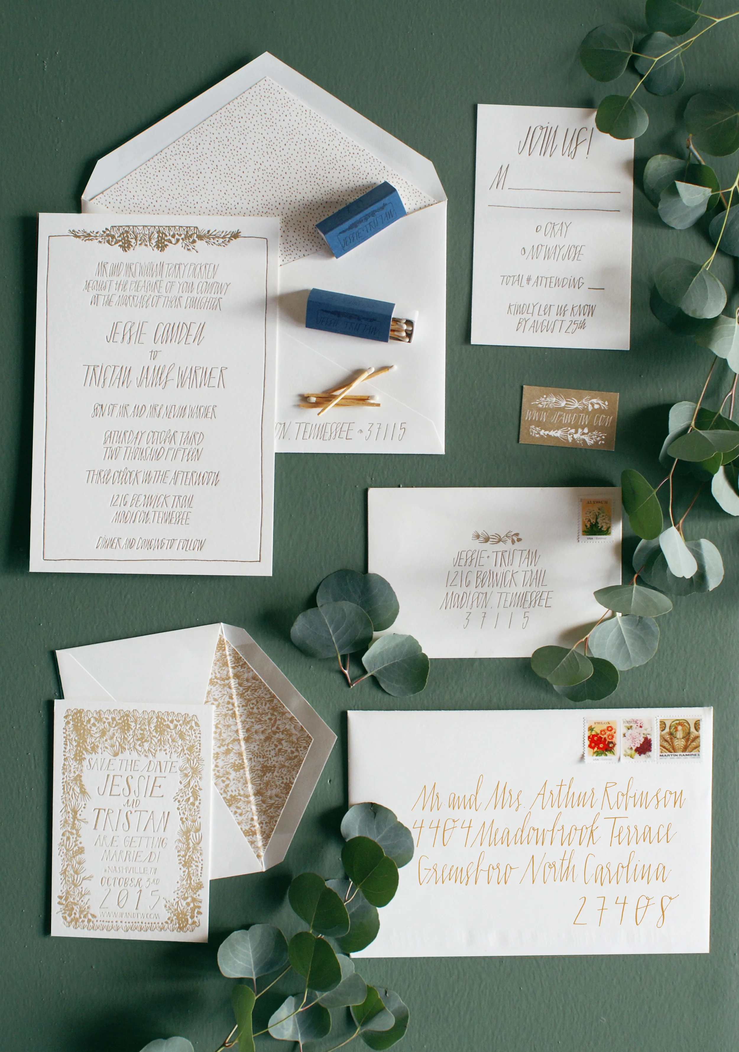 THIS SUITE IS EXTRA SPECIAL TO HEW BECAUSE IT'S THE OWNERS REAL WEDDING INVITATION! THE DESIGNS, INSPIRED BY THE BRIDE AND GROOMS LOT ON THE CUMBERLAND RIVER WHERE THEY WERE MARRIED, WERE LETTERPRESSED IN A RICH BRASS INTO 100% COTTON (TREE-FREE!) PAPER. THE ENVELOPES WERE CALLIGRAPHED IN GOLD INK AND THE TYPEFACE IS A SPECIAL FONT DEVELOPED BY HAND IN-HOUSE.